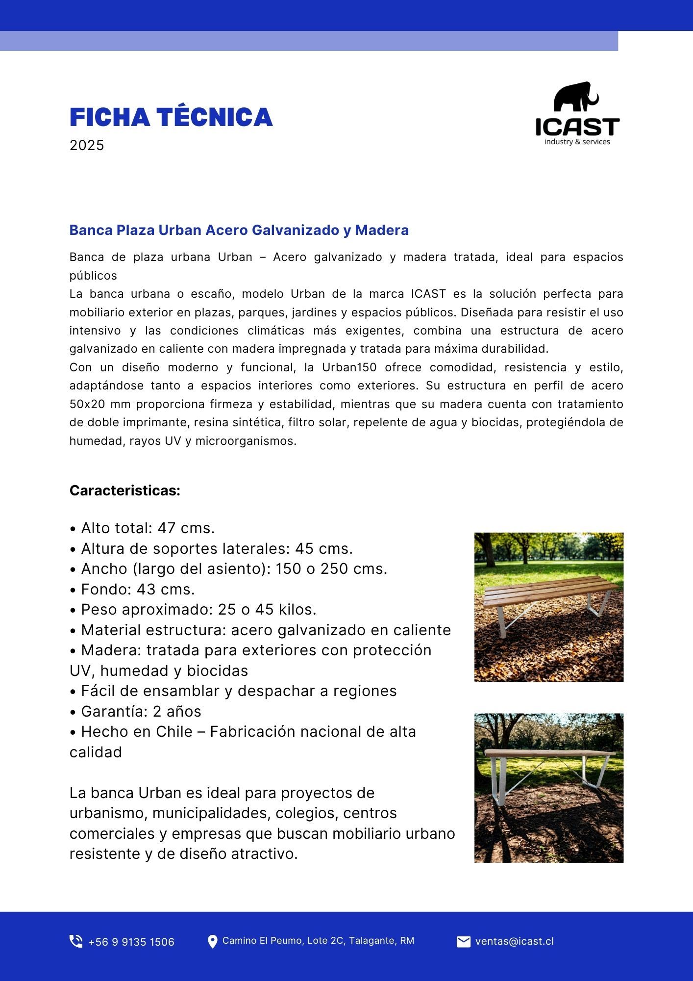 La banca urbana o escaño, modelo Urban300 de la marca ICAST es la solución perfecta para mobiliario exterior en plazas, parques, jardines y espacios públicos. Diseñada para resistir el uso intensivo y las condiciones climáticas más exigentes, combina una estructura de acero galvanizado en caliente con madera impregnada y tratada para máxima durabilidad.